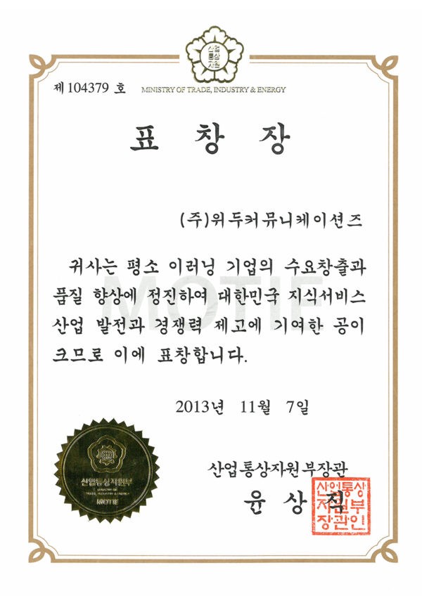 이러닝 기업의 수요 창출과 품질 향상 페이지 정보 작성자 WeDu 댓글 0건 조회 5,533회 작성일 19-05-30 19:32 본문 2013-11-07 표창장 제 104379호 이러닝 기업의 수요 창출과 품질 향상 산업통상자원부장관 윤상직 List Previous한국여성벤처협회 표창장 19.05.30 Next이러닝 콘텐츠 품질 인증 우수 심사 19.05.30