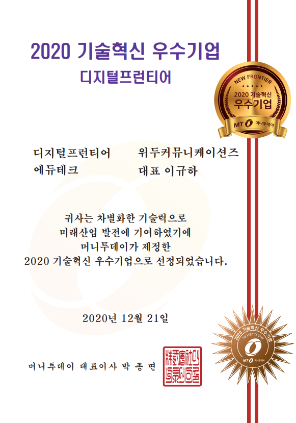 2020 기술혁신 우수기업 페이지 정보 작성자 WeDu 댓글 0건 조회 5,787회 작성일 21-12-31 12:58 본문 2020-12-21 2020 기술혁신 우수기업 디지털프런티어 에듀테크 머니투데이 대표이사 List Previous2020 소년한국 우수 어린이 도서 선정 21.12.31 Next2020 서울산업진흥원 2020 DMC어워드 21.12.31