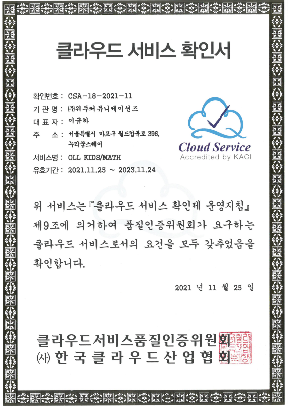 [한국/인증서] OLL KIDS/MATH 클라우드 서비스 확인서 페이지 정보 작성자 WeDu 댓글 0건 조회 9,091회 작성일 21-12-31 12:46 본문 2021-11-25 확인번호 CSA-18-2021-11 서비스명 : OLL KIDS/MATH List Previous[한국/확인서] OLL KIDS/MATH 파스-타 호환성 확인서 21.12.31 Next[한국/저작권] 장보기 인지훈련 게임 21.12.31