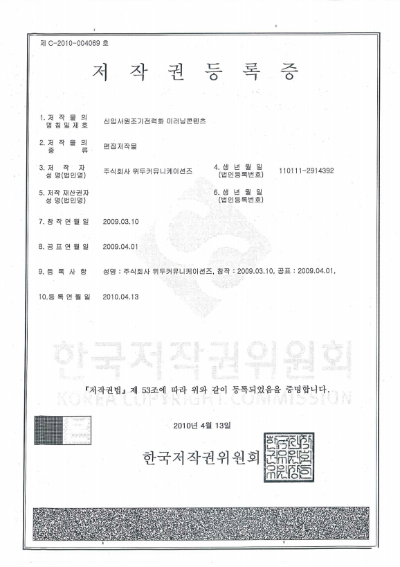 [한국/저작권] 신입사원조기전력화 이러닝 콘텐츠 페이지 정보 작성자 WeDu 댓글 0건 조회 5,789회 작성일 19-05-30 19:01 본문 2010-04-13 저작권 C-2010-004069 신입사원조기전력화 이러닝콘텐츠 / 편집저작물 List Previous[한국/저작권] 리안의 수학 모험 19.05.30 Next[한국/상표] OLL 41류 19.05.30